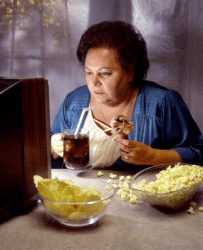 A woman binges on junk food and TV.