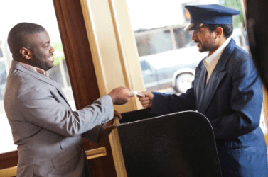 A hotel valet assists a guest.