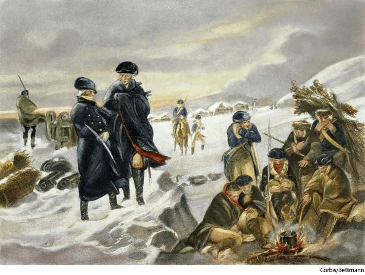 Valley ForgeNONE(无词性) Valley ForgeGeorge Washington (standing right) and the Marquis de Lafayette (standing left) at Valley Forge, after a painting by Alonzo Chappel (1828-1887)- A village of southeast Pennsylvania on the Schuylkill River northwest of Philadelphia. It was the site of the Continental Army headquarters from December 1777 to June 1778. The encampment was subjected to severe winter weather that caused extensive illness and suffering.福吉谷:美国宾夕法尼亚东南部的一个村子,位于费城西北部的斯凯奇尔河上。它是1777年12月到1778年6月大陆军司令部所在地,此营地受到严冬天气的影响,导致了广泛传播的疾病和痛苦