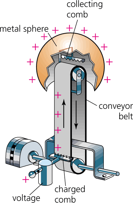 Van de Graaff generator AHD[vănʹ də grăf'] D.J.[ˈvæn də ˌgræf]K.K.[ˈvæn də ˌgræf]n.(名词) Clarinda/Academy Artworks- An electrostatic generator in which an electric charge is either removed from or transferred to a large hollow spherical electrode by a rapidly moving belt, accelerating particles to energies of about ten million electron volts.范德格喇夫起电机:一种静电起电机,其中一个电荷被移出或被转化到一个大的中空球形电极。通过快速运动的皮带,把微粒加速到大约一千万电伏,以达到上述效果