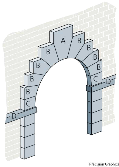 1. One of the wedge-shaped stones forming the curved parts of an arch or a vaulted ceiling.拱楔块:用于形成拱或穹窿的曲线部分的楔形石头中的一块