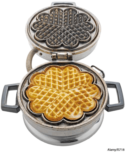 An appliance having hinged, indented plates that impress a grid pattern into waffle batter as it bakes.