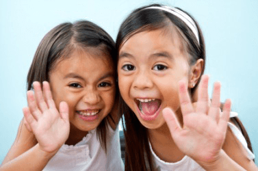 Two little girls wave.