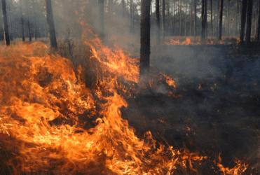 A wildfire in a forest.