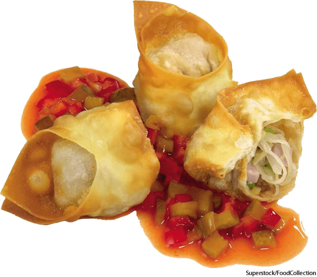 1. A noodle-dough dumpling filled typically with spiced minced pork or other ground meat, usually boiled in soup or fried and eaten as a side dish.馄饨,云吞:一种面团,一般填满加调料的猪肉馅或其他肉馅,通常在汤中煮或油炸作为一种配菜吃