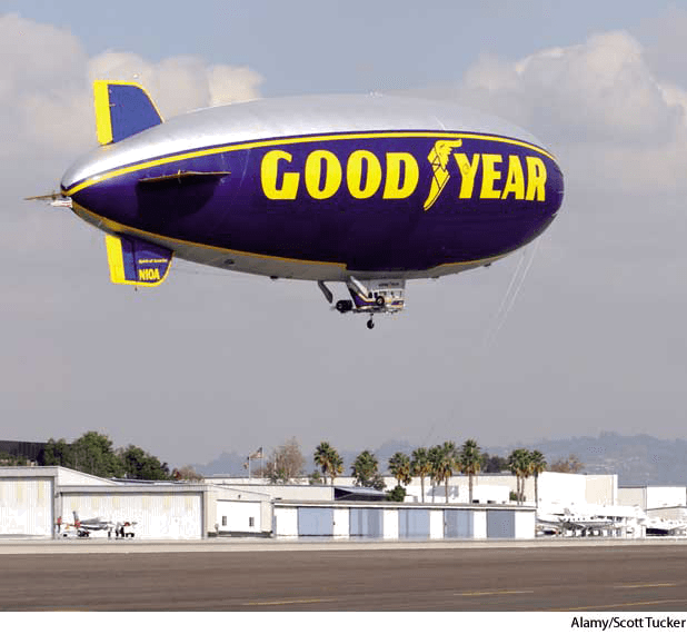 A nonrigid, buoyant airship. Modern blimps use helium instead of hydrogen to maintain buoyancy.