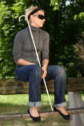 A blind woman sitting on a fence.