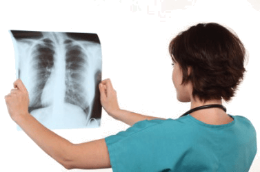 A doctor views an X-ray of a patient's chest.