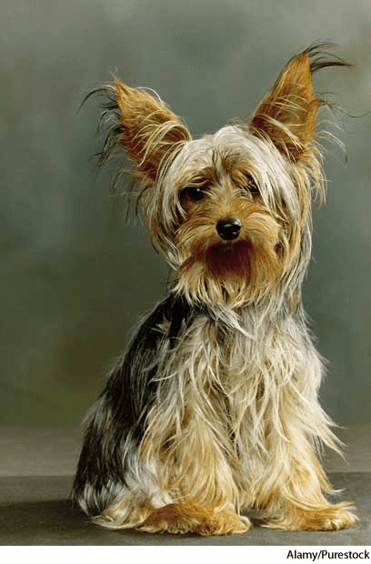 约克郡㹴:产于约克郡的一种观赏㹴,长有柔滑的蓝灰色长毛