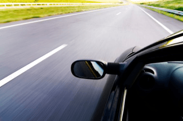 A car zooms down the road.