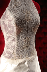 A white dress with a lace bodice.