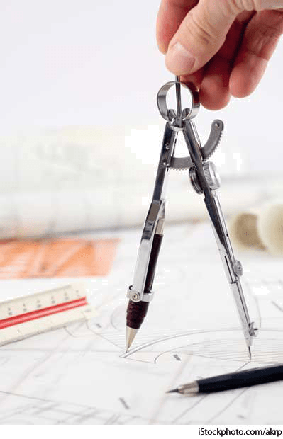 A drawing compass with legs that are connected by an adjustable metal spring band.