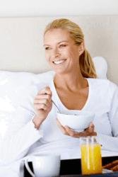A woman enjoys breakfast in bed.