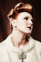 A woman wearing a brooch.