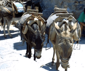 Several donkeys being used as beasts of burden.