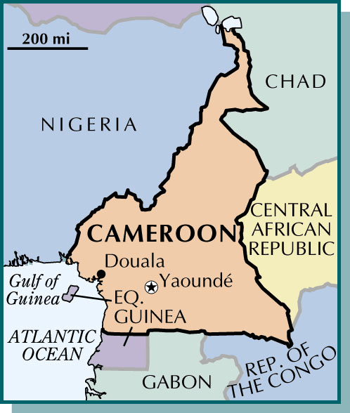 Cam·e·roon AHD[kăm'ə-ro͞onʹ] 也作 Came·roun [käm-ro͞onʹ] D.J.[ˌkæməˈruːn] 也作 Came·roun [kɑːmˈruːn]K.K.[ˌkæməˈrun] 也作 Came·roun [kɑmˈrun]NONE(无词性) - A country of west-central Africa on the Bight of Biafra. Comprising the former French Cameroons and the southern part of British Cameroons, it became independent in 1960. Yaoundé is the capital and Douala the largest city. Population, 9,542,400.喀麦隆:靠近比夫拉湾的一个中西非国家。由前法属喀麦隆和英属喀麦隆的南部组成,1960年独立。首都是雅温得,最大城市是杜阿拉。人口9,542,400