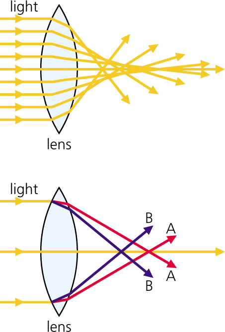 - An imperfect image caused by a physical defect in an optical element, as in a lens.色差:由于光学器件(如透镜)的物理缺陷而造成的不完美成像