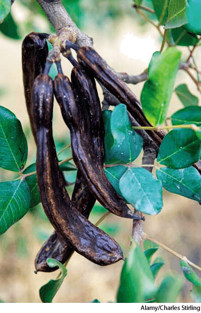 car·ob AHD[kărʹəb] D.J.[ˈkærəb]K.K.[ˈkærəb]n.(名词) carobripe carob podsCeratonia siliqua- An eastern Mediterranean evergreen tree(Ceratonia siliqua) in the pea family, having pinnately compound leaves and large, dark, leathery pods. 角豆树:地中海东部地区一种豆科常青乔木(长角豆 长角豆属) ,有羽状复叶和黑色坚韧的大豆荚