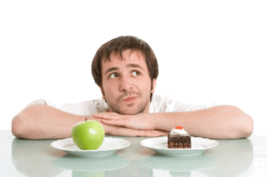 A man trying to make the choice between an apple or a dessert.