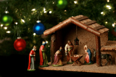 Figures depicting the birth of Christ under a Christmas tree.