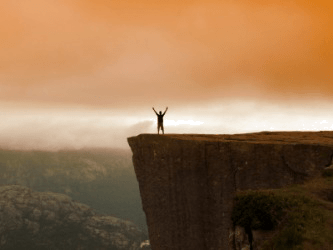 A hiker stands on top of a cliff.