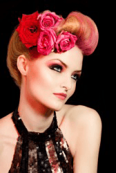A womans coiffure decorated with flowers.