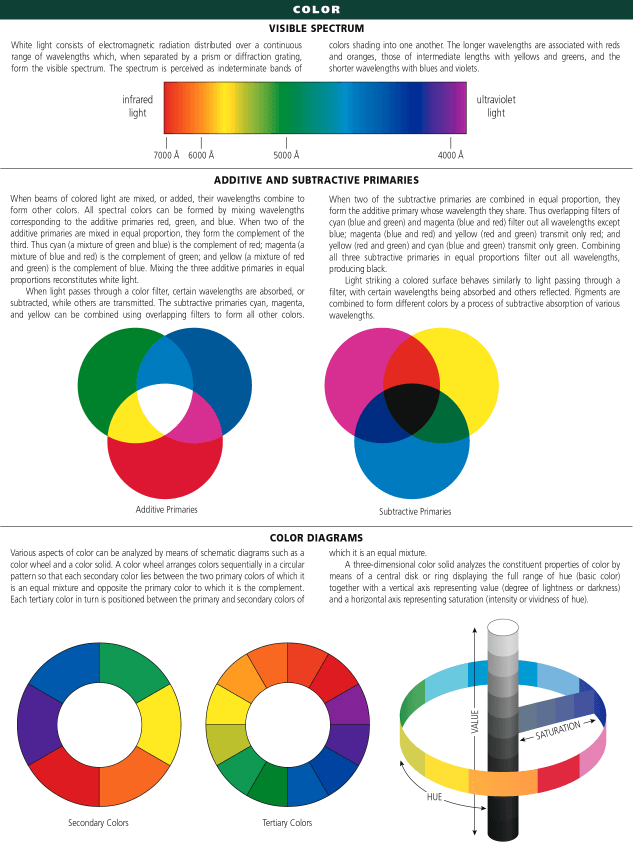 1. The appearance of objects or light sources described in terms of the individual's perception of them, involving hue, lightness, and saturation for objects and hue, brightness, and saturation for light sources.色调,色彩:物体或光源的视觉表象,包括物体及光源的色彩、光亮度及饱和度