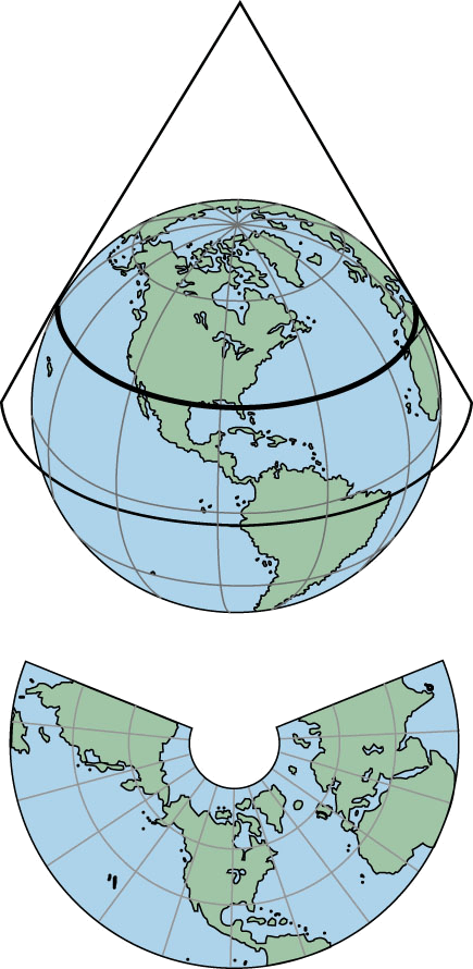 conic projection 或 conical projectionn.(名词) Clarinda/Academy Artworks- A method of projecting maps of parts of the earth's spherical surface on a surrounding cone, which is then flattened to a plane surface having concentric circles as parallels of latitude and radiating lines from the apex as meridians.圆锥投影:一种绘图方法,将一空心圆锥置于球体上,当圆锥展平时切线就是制图地区的中央纬线,所有的纬线都是诸同心圆的弧,而经线是从圆锥顶点向标准纬线各部分所绘的直线