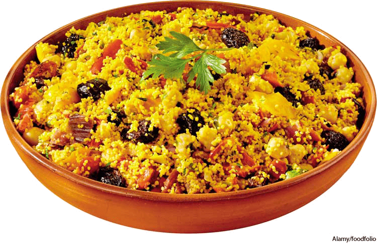 - A traditional North African dish consisting of pasta steamed with a meat and vegetable stew.蒸粗麦粉食品:一种北非传统菜,由肉、炖菜和粗面粉蒸成