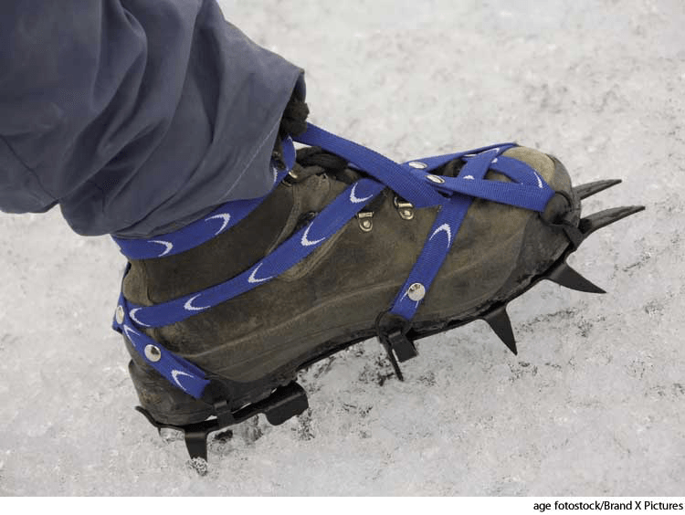 - An iron spike attached to the shoe to prevent slipping when walking on ice or climbing. Also called In this sense, also called climbing iron 尖铁钉:在冰上行走或爬山时防止滑倒而装在鞋上的铁钉 也作 在此意义上也可称作 climbing iron