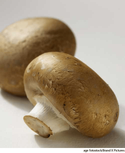 洋菇,双孢蘑菇:有圆形菌盖的深棕色可食蘑菇(双孢蘑菇)