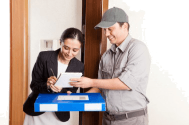 A woman accepts delivery of a package.