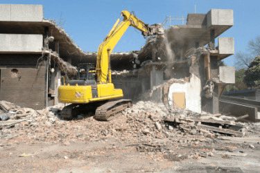 An excavator engaged in the destruction of a building.