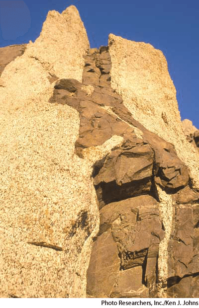 - Geology A long mass of igneous rock that cuts across the structure of adjacent rock.【地质学】 岩墙:横切毗连岩石结构的大长块火成岩