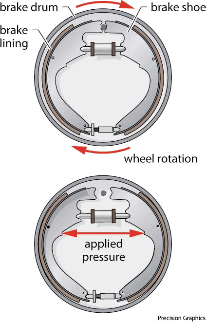 鼓式制动器:一种制动器,透过刹车转动鼓内面与摩擦衬片相接合而产生摩擦力