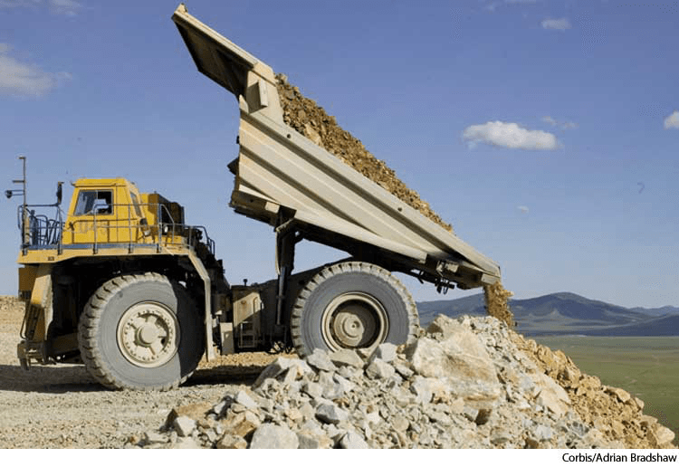 A heavy-duty truck having a bed that tilts backward to dump loose material.
