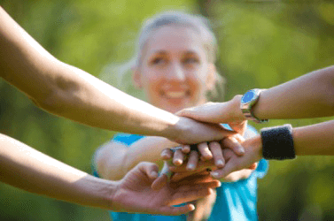 A group of people clasping hands in mutual encouragement.