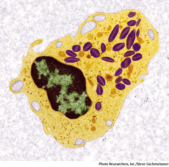 1. A type of white blood cell found in vertebrate blood, containing cytoplasmic granules that are easily stained by eosin or other acid dyes.嗜曙红血球:脊椎动物血液中的一种白血球,含有容易被曙红或其它酸性染料染色的细胞质微粒