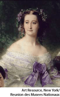 Eu·gé·nie AHD[yo͞o-jēʹnē, œ-zhā-nēʹ] (1826-1920) D.J.[juːˈdʒiːniː, ɜːʒeɪˈniː]K.K.[juˈdʒini, ɝʒeˈni]NONE(无词性) Eugéniedetail from 1855 painting The Empress Eugénie Surrounded by Her Ladies in Waiting, by Franz Xaver Winterhalter(1805-1873)- Empress of France (1853-1871) as the wife of Napoleon III. She acted as regent during the emperor's absences and is believed to have had an influence on events that led to the Franco-Prussian War of 1870, which ended in defeat for France.欧几妮皇后:法国皇后(1853-1871年),拿破仑三世之妻,她在皇帝不在时起摄政者的作用,并被认为在导致1870年普法战争的一系列事件中产生过影响。这场战争以法国的失败而告终