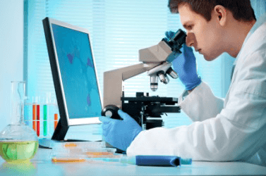 A scientist examines something under a microscope.