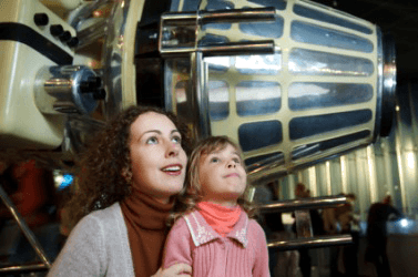 A mother and daughter at an astronautics exhibit.