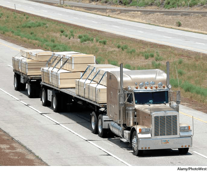 平板载货车:一种用于载运重型机器、轿车或房屋等大型物体的开放式载货汽车或平板式挂车