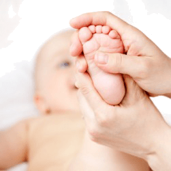 A mother massages her baby's foot.