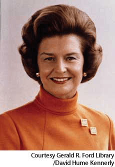 Ford, Elizabeth Bloomer Known as "Betty.”(Born 1918)NONE(无词性) Betty Ford- First Lady of the United States (1974-1977) as the wife of President Gerald R. Ford. She supported the Equal Rights Amendment, the arts, and programs for disabled children.福特,伊丽莎白·布罗默:(生于 1918) 美国第一夫人(1974-1977年),总统拉德杰尔·R·福特的妻子。她支持平等权利法案,倡导为残疾儿童举行的艺术活动及计划