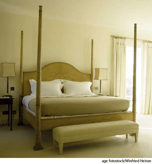 有四根帷柱的床:有很高的原意为支持床的华盖或顶棚的角柱的床