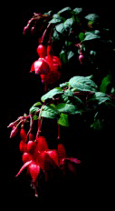 Close up of the leaves and flowers of a fuchsia plant.