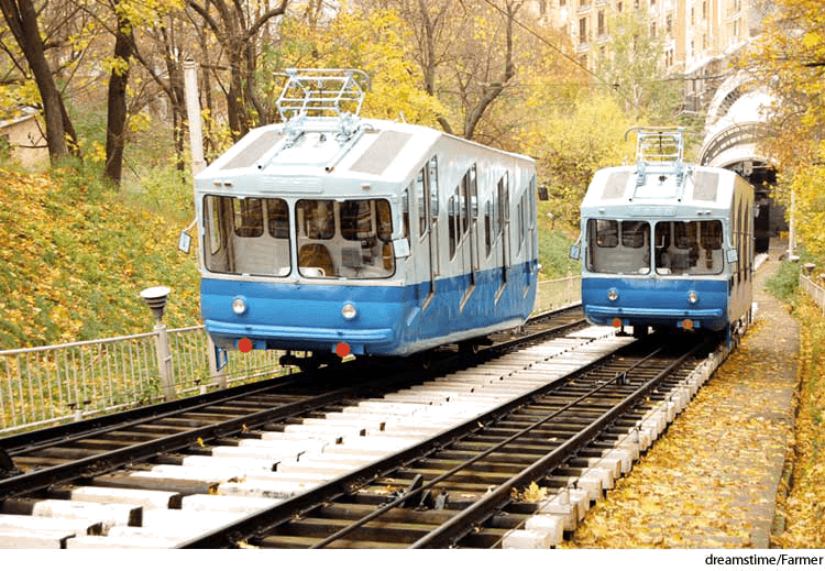n.(名词)- A cable railway on a steep incline, especially such a railway with simultaneously ascending and descending cars counterbalancing one another.缆索铁路:一种在陡坡上的有互起平衡作用并同时升降的车的缆车道