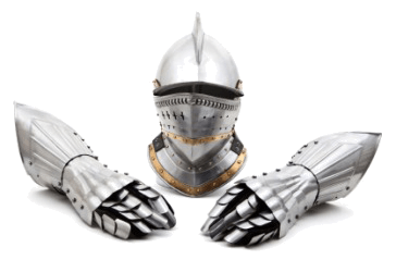 The helmet from a suit of armour with a pair of gauntlets.