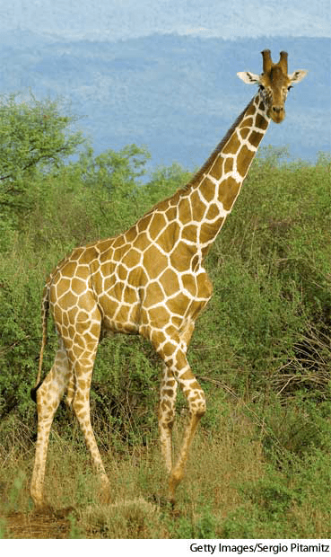 1. An African ruminant mammal(Giraffa camelopardalis) having a very long neck and legs, a tan coat with orange-brown to black blotches, and short horns. It is the tallest land animal, often reaching a height of 5 meters (16½ feet), and feeds principally by browsing in the tree canopy of wooded grasslands. 长颈鹿:一种非洲的反刍哺乳动物(长颈鹿) ,有很长的脖子和腿,有黄褐色到黑色的斑点和短短的角。它是陆上最高的动物,经常达到5米高(16.5英尺)。主要吃长满树木的草原上的树木顶端嫩叶