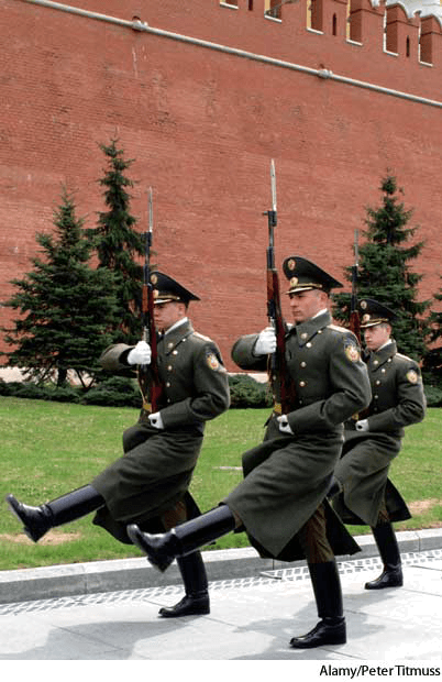 正步:一种军队阅兵时的步法:从臀部开始两腿摆动,而膝关节保持站立时的状态
